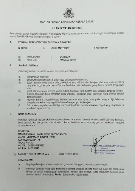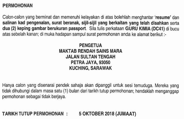 Iklan Jawatan Kosong Guru MRSM - Sarawak